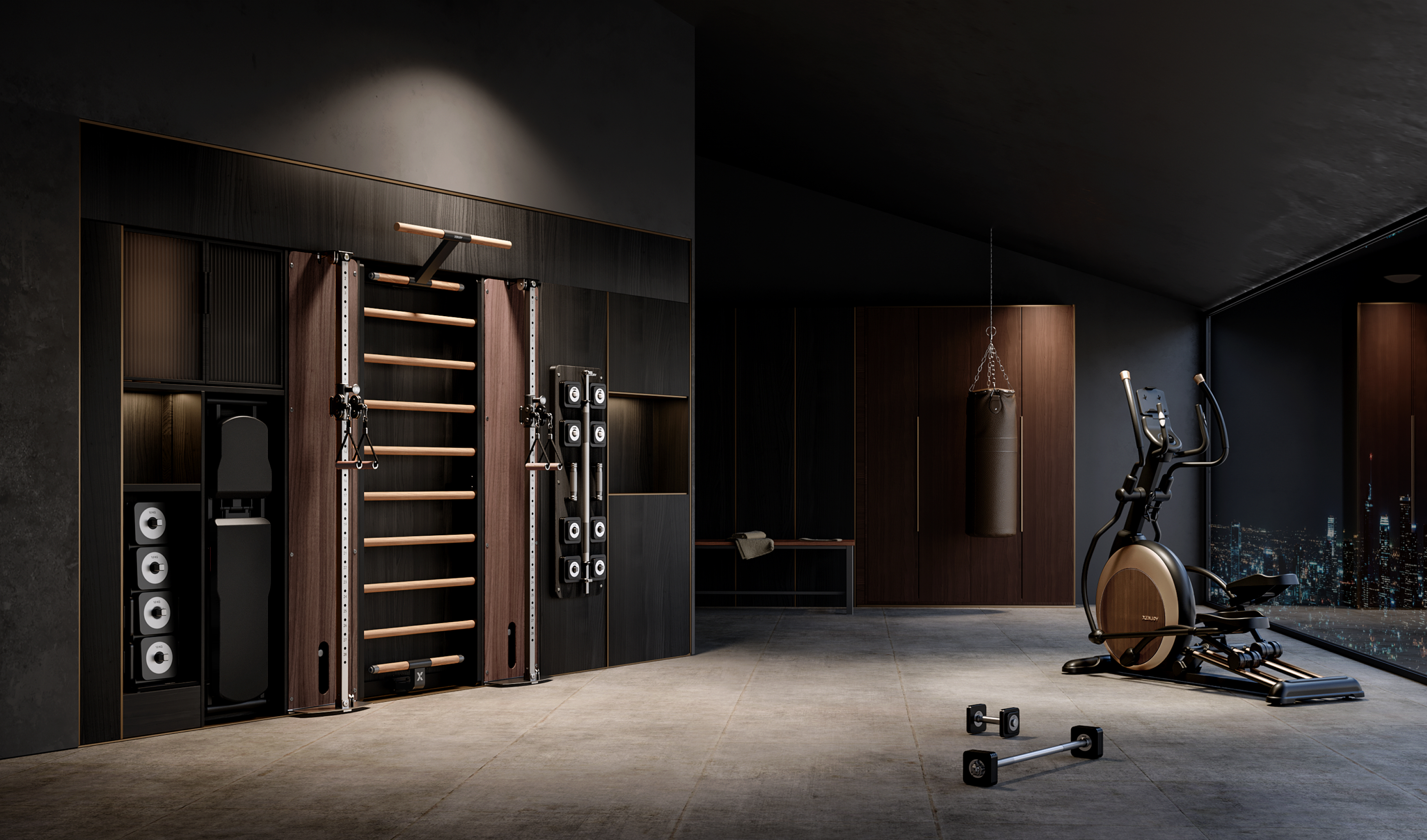 Xenjoy began with a question: why must the tools that care for our well-being be things we hide? We answered by marrying premium performance with refined design. The “x” marks the intersection where precision engineering and high-grade North American walnut meet—so your workout ends and your piece of functional art slips back into the room.